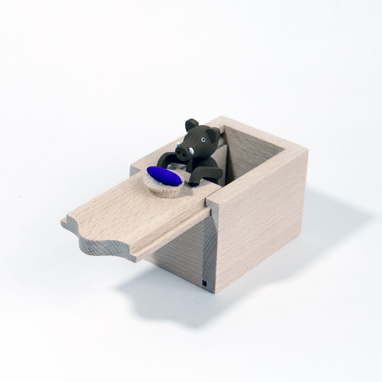 木の小箱のフタゆっくりを引くと、中から干支の「いのしし」が顔を出します。
