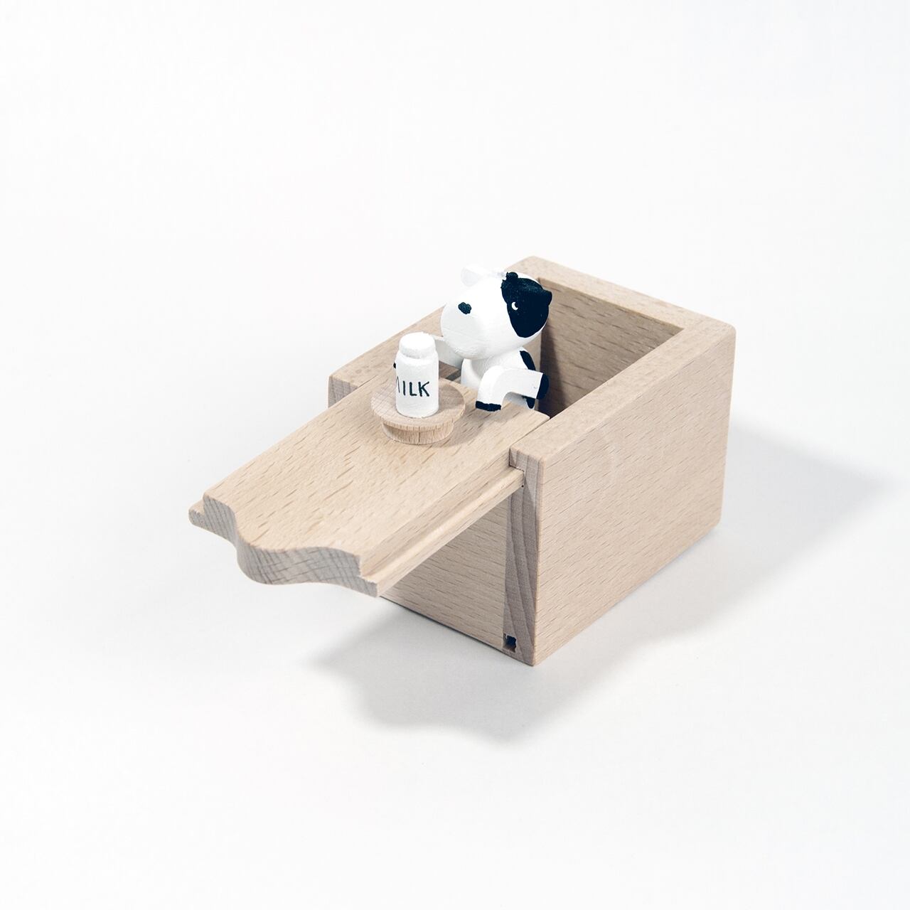 木の小箱のフタゆっくりを引くと、中から干支の「うし」が顔を出します。